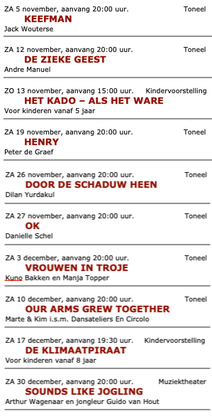 Er komen weer kindervoorstellingen, is er gevarieerd cabaret, diverse jeugdpodia, is er kleinkunst, de koffieconcerten op de zondagmorgen en uiteraard niet te vergeten weer onze alom bekende en geprezen Zondagmiddag Live! optredens.